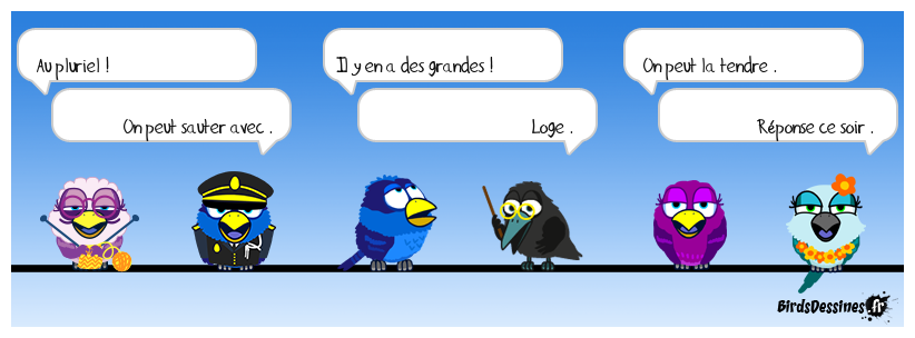 Case 1:Bird 1: Au pluriel !Bird 2: On peut sauter avec . | Case 2: Bird 1: Il y en a des grandes ! Bird 2: Loge . | Case 3: Bird 1: On peut la tendre . Bird 2: Réponse ce soir .
