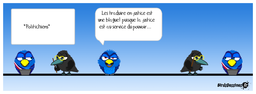 Case 1:Bird 1: "Politichiens" | Case 2: Bird 1: Les traduire en justice est une blague! puisque la justice est au service du pouvoir... | Case 3:
