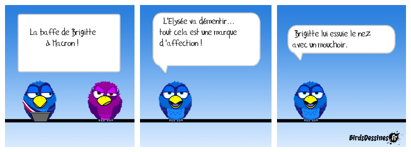 Case 1:Bird 1: La baffe de Brigitte à Macron ! | Case 2: Bird 1: L'Elysée va démentir... tout cela est une marque d 'affection ! | Case 3: Bird 1: Brigitte lui essuie le nez avec un mouchoir.