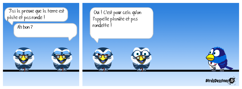 Case 1:Bird 1: J'ai la preuve que la terre est plate et pas ronde !Bird 2: Ah bon ? | Case 2: Bird 1: Oui ! C'est pour cela qu'on l'appelle planète et pas rondette ! | Case 3: