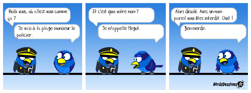 Case 1:Bird 1: Holà vous, où allez vous comme ça ? Bird 2: Je vais à la plage monsieur le policier. | Case 2: Bird 1: Et c'est quoi votre nom ? Bird 2: Je m'appelle Megot. | Case 3: Bird 1: Alors désolé. Avec un nom pareil vous êtes interdit. Oust ! Bird 2: Ben merde.