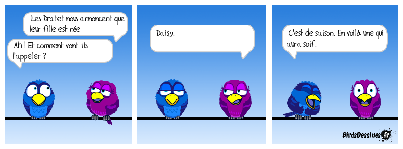 Case 1:Bird 1: Les Dratet nous annoncent que leur fille est néeBird 2: Ah ! Et comment vont-ils l'appeler ? | Case 2: Bird 1: Daisy. | Case 3: Bird 1: C'est de saison. En voilà une qui aura soif.