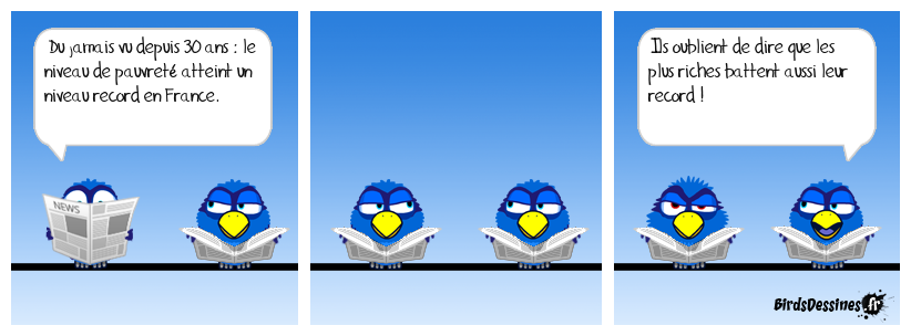 Case 1:Bird 1: Du jamais vu depuis 30 ans : le niveau de pauvreté atteint un niveau record en France. | Case 2: | Case 3: Bird 1: Ils oublient de dire que les plus riches battent aussi leur record !