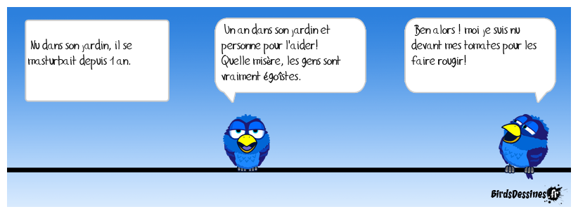 Case 1:Bird 1: Nu dans son jardin, il se masturbait depuis 1 an. | Case 2: Bird 1: Un an dans son jardin et personne pour l'aider! Quelle misère, les gens sont vraiment égoïstes. | Case 3: Bird 1: Ben alors ! moi je suis nu devant mes tomates pour les faire rougir!