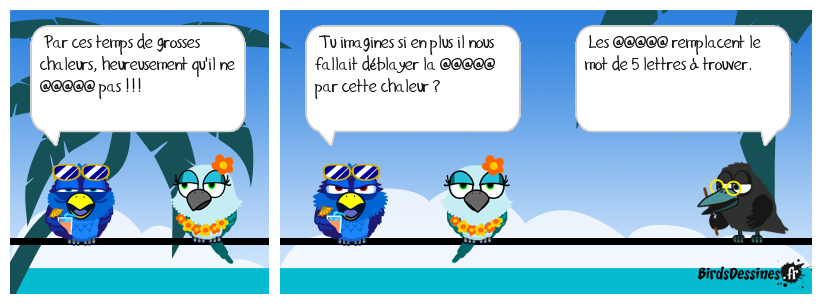 Case 1:Bird 1: Par ces temps de grosses chaleurs, heureusement qu'il ne @@@@@ pas !!! | Case 2: Bird 1: Tu imagines si en plus il nous fallait déblayer la @@@@@ par cette chaleur ? | Case 3: Bird 1: Les @@@@@ remplacent le mot de 5 lettres à trouver.