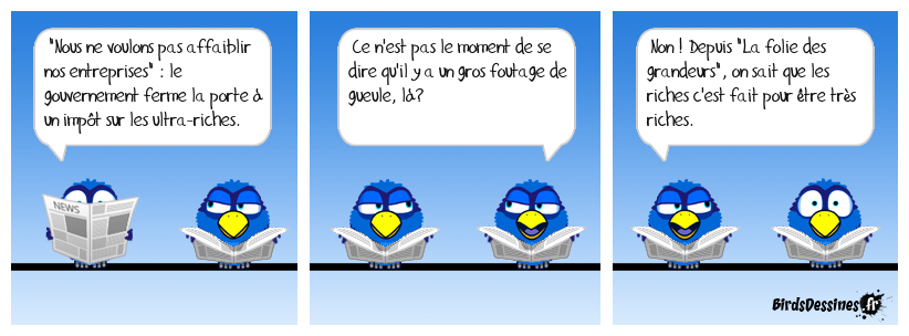 Case 1:Bird 1: "Nous ne voulons pas affaiblir nos entreprises" : le gouvernement ferme la porte à un impôt sur les ultra-riches. | Case 2: Bird 1: Ce n'est pas le moment de se dire qu'il y a un gros foutage de gueule, là? | Case 3: Bird 1: Non ! Depuis "La folie des grandeurs", on sait que les riches c'est fait pour être très riches.