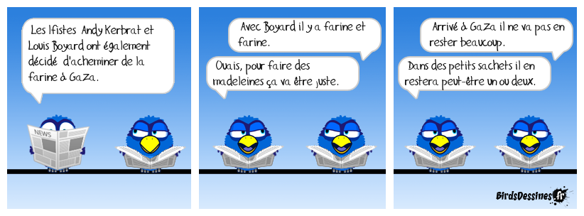 Case 1:Bird 1: Les lfistes Andy Kerbrat et Louis Boyard ont également décidé d'acheminer de la farine à Gaza. | Case 2: Bird 1: Avec Boyard il y a farine et farine. Bird 2: Ouais, pour faire des madeleines ça va être juste. | Case 3: Bird 1: Arrivé à Gaza il ne va pas en rester beaucoup. Bird 2: Dans des petits sachets il en restera peut-être un ou deux.