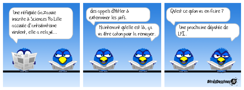 Case 1:Bird 1: Une réfugiée Gazaouie inscrite à Sciences Po Lille accusée d’antisémitisme virulent, elle a relayé... | Case 2: Bird 1: des appels d'Hitler à exterminer les juifs. Bird 2: Maintenant qu'elle est là, ça va être coton pour la renvoyer. | Case 3: Bird 1: Qu'est ce qu'on va en faire ? Bird 2: Une prochaine députée de LFI..