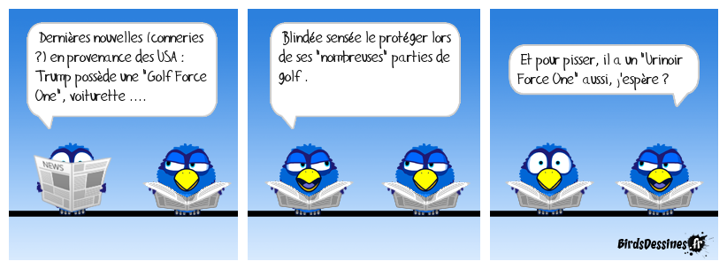 Case 1:Bird 1: Dernières nouvelles (conneries ?) en provenance des USA : Trump possède une "Golf Force One", voiturette .... | Case 2: Bird 1: Blindée sensée le protéger lors de ses "nombreuses" parties de golf . | Case 3: Bird 1: Et pour pisser, il a un "Urinoir Force One" aussi, j'espère ?