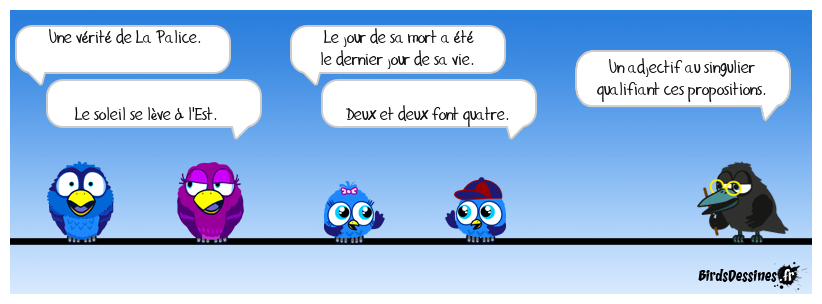 Case 1:Bird 1: Une vérité de La Palice.Bird 2: Le soleil se lève à l'Est. | Case 2: Bird 1: Le jour de sa mort a été le dernier jour de sa vie. Bird 2: Deux et deux font quatre. | Case 3: Bird 1: Un adjectif au singulier qualifiant ces propositions.