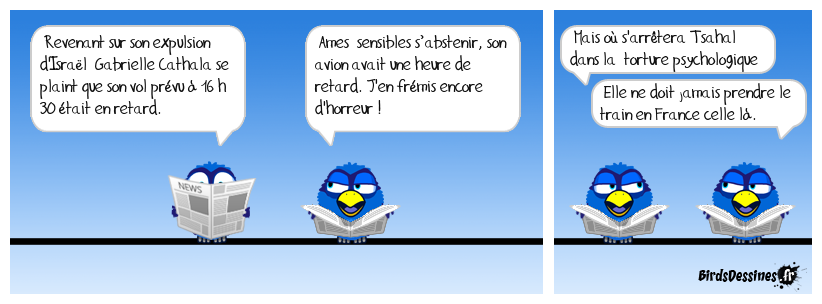 Case 1:Bird 1: Revenant sur son expulsion d'Israël Gabrielle Cathala se plaint que son vol prévu à 16 h 30 était en retard. | Case 2: Bird 1: Ames sensibles s’abstenir, son avion avait une heure de retard. J'en frémis encore d'horreur ! | Case 3: Bird 1: Mais où s'arrêtera Tsahal dans la torture psychologique ? Bird 2: Elle ne doit jamais prendre le train en France celle là.