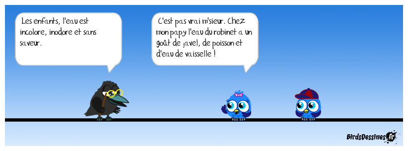 Case 1:Bird 1: Les enfants, l'eau est incolore, inodore et sans saveur. | Case 2: Bird 1: C'est pas vrai m'sieur. Chez mon papy l'eau du robinet a un goût de javel, de poisson et d'eau de vaisselle ! | Case 3: