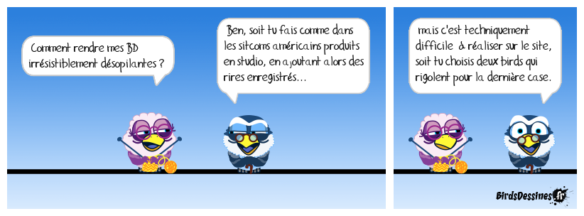 Case 1:Bird 1: Comment rendre mes BD irrésistiblement désopilantes ? | Case 2: Bird 1: Ben, soit tu fais comme dans les sitcoms américains produits en studio, en ajoutant alors des rires enregistrés... | Case 3: Bird 1: mais c'est techniquement difficile à réaliser sur le site, soit tu choisis deux birds qui rigolent pour la dernière case.