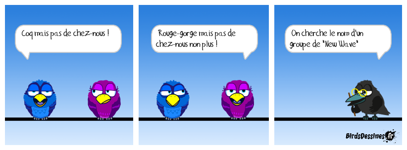 Case 1:Bird 1: Coq mais pas de chez-nous ! | Case 2: Bird 1: Rouge-gorge mais pas de chez-nous non plus ! | Case 3: Bird 1: On cherche le nom d'un groupe de "New Wave" américain !