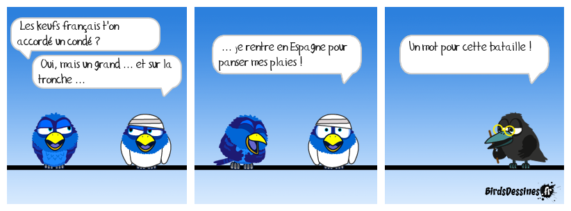 Case 1:Bird 1: Les keufs français t'on accordé un condé ?Bird 2: Oui, mais un grand ... et sur la tronche ... | Case 2: Bird 1: ... je rentre en Espagne pour panser mes plaies ! | Case 3: Bird 1: Un mot pour cette bataille !