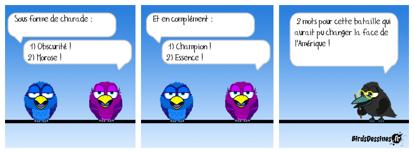 Case 1:Bird 1: Sous forme de charade :Bird 2: 1) Obscurité ! 2) Morose ! | Case 2: Bird 1: Et en complément : Bird 2: 1) Champion ! 2) Essence ! | Case 3: Bird 1: 2 mots pour cette bataille qui aurait pu changer la face de l'Amérique !