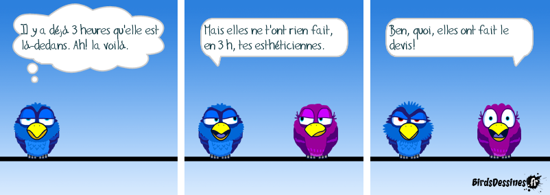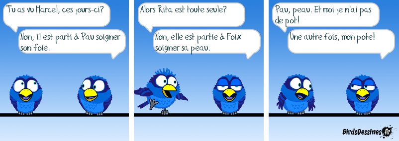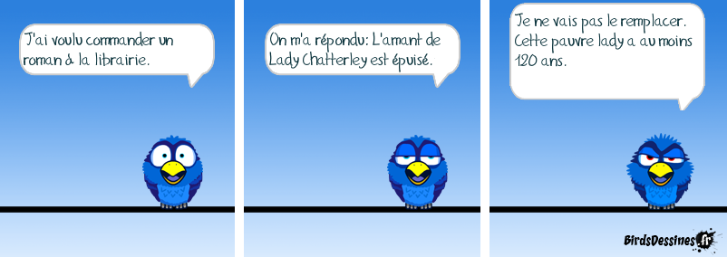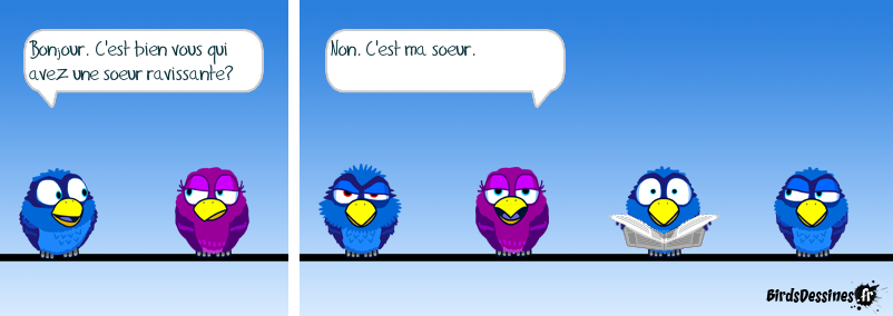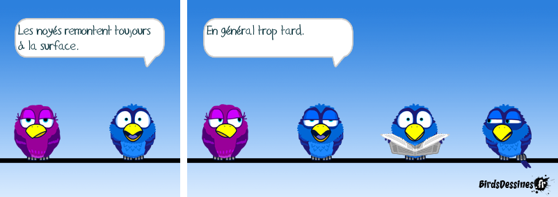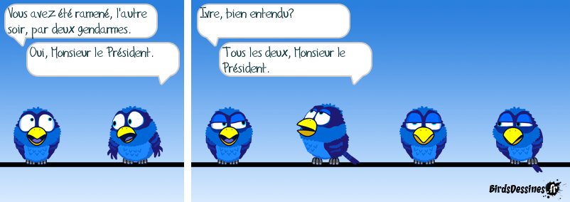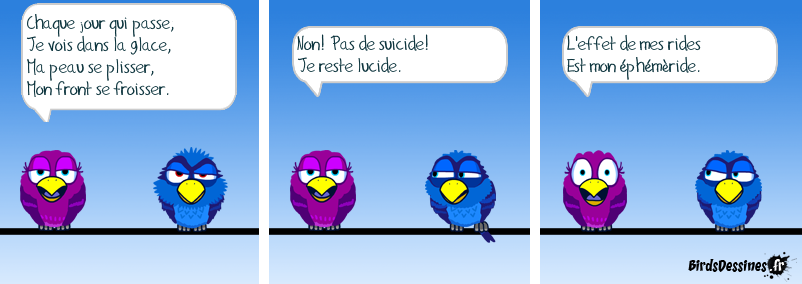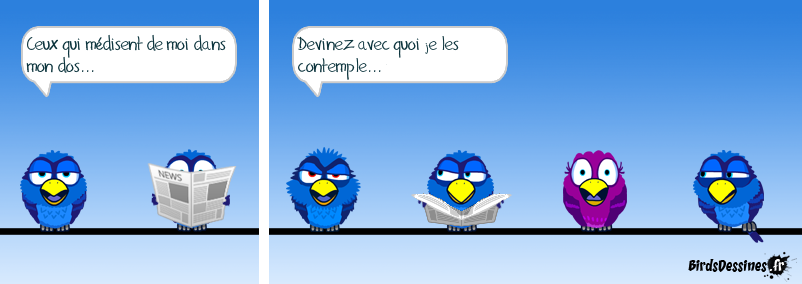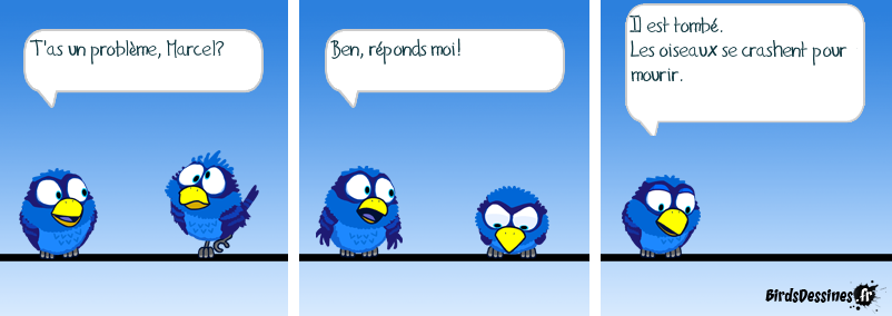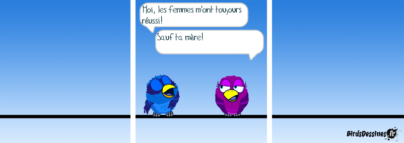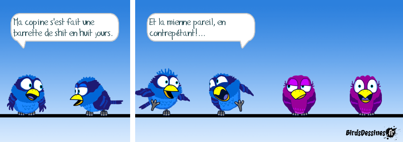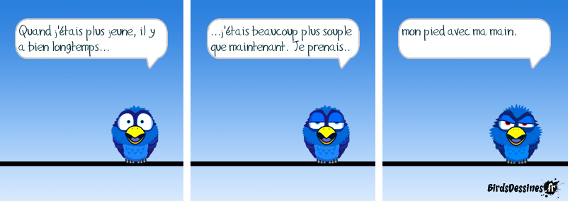 Des birds disent des bourdes, parfois border-line. Ca doit barder chez les modos! Je suis dans l'âge d'or, comme on dit au Québec, et je dépasse de beaucoup les 6 minutes de rire par jour, préconisées par la faculté. Ce n'est pas parce que le temps presse, ça dure depuis très longtemps. Je suis mu par la passion des sons et des mots. Et des modos...